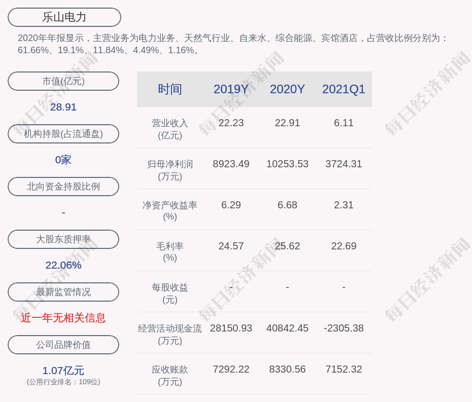 2020年年报显示,乐山电力的主营业务为电力业务、天然气行业、自来水、综合能源、宾馆酒店,占营收比例分别为:61.66%、19.1%、11.84%、4.49%、1.16%。