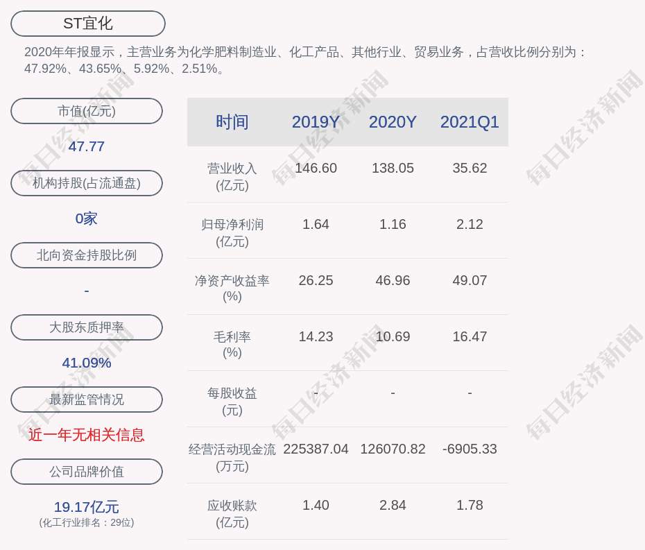 2020年年报显示,ST宜化的主营业务为化学肥料制造业、化工产品、其他行业、贸易业务,占营收比例分别为:47.92%、43.65%、5.92%、2.51%。