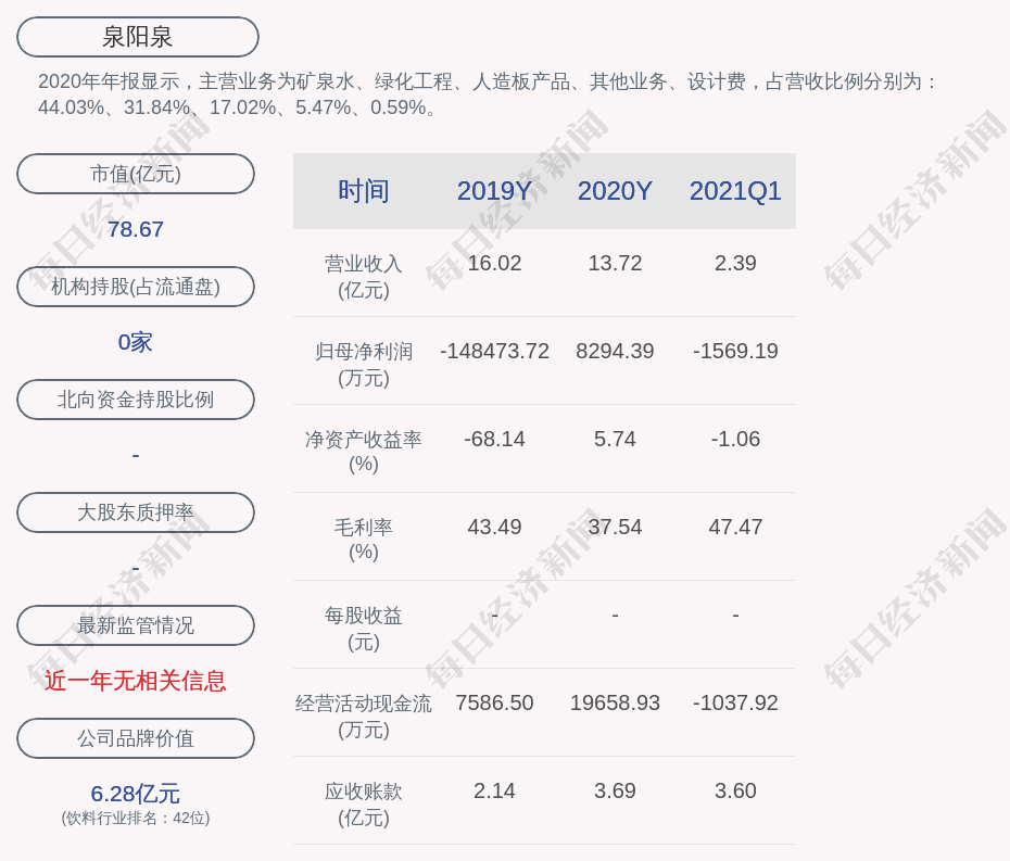 2020年年报显示,泉阳泉的主营业务为矿泉水、绿化工程、人造板产品、其他业务、设计费,占营收比例分别为:44.03%、31.84%、17.02%、5.47%、0.59%。