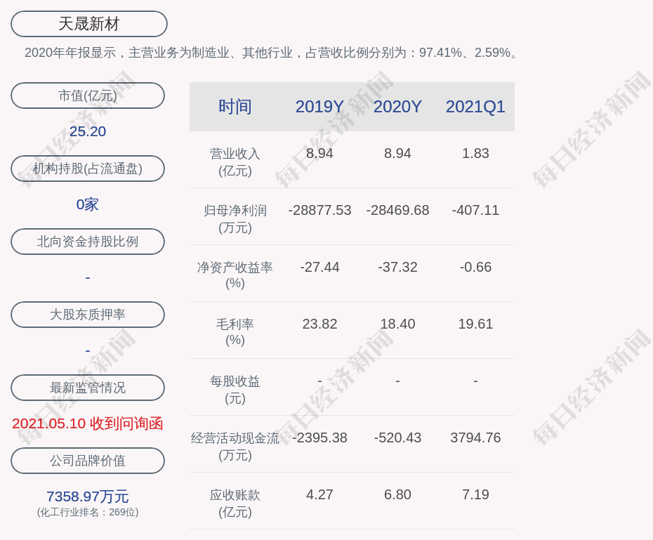 2020年年报显示,天晟新材的主营业务为制造业、其他行业,占营收比例分别为:97.41%、2.59%。