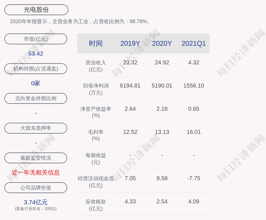 2020年年报显示,光电股份的主营业务为工业,占营收比例为:98.78%。