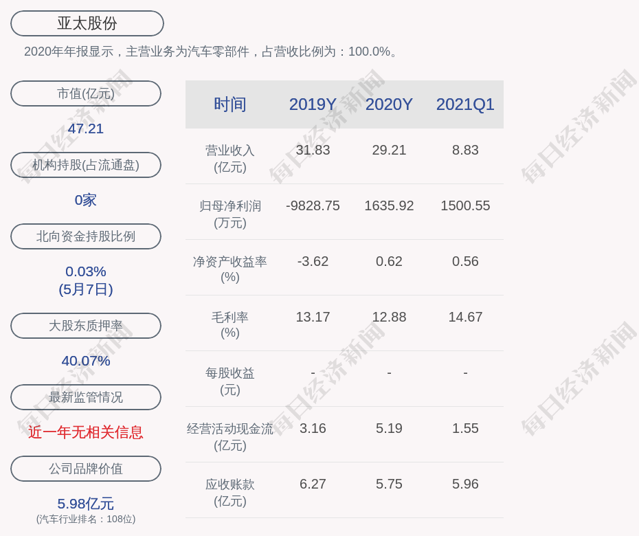 2020年年报显示,亚太股份的主营业务为汽车零部件,占营收比例为:100.0%。
