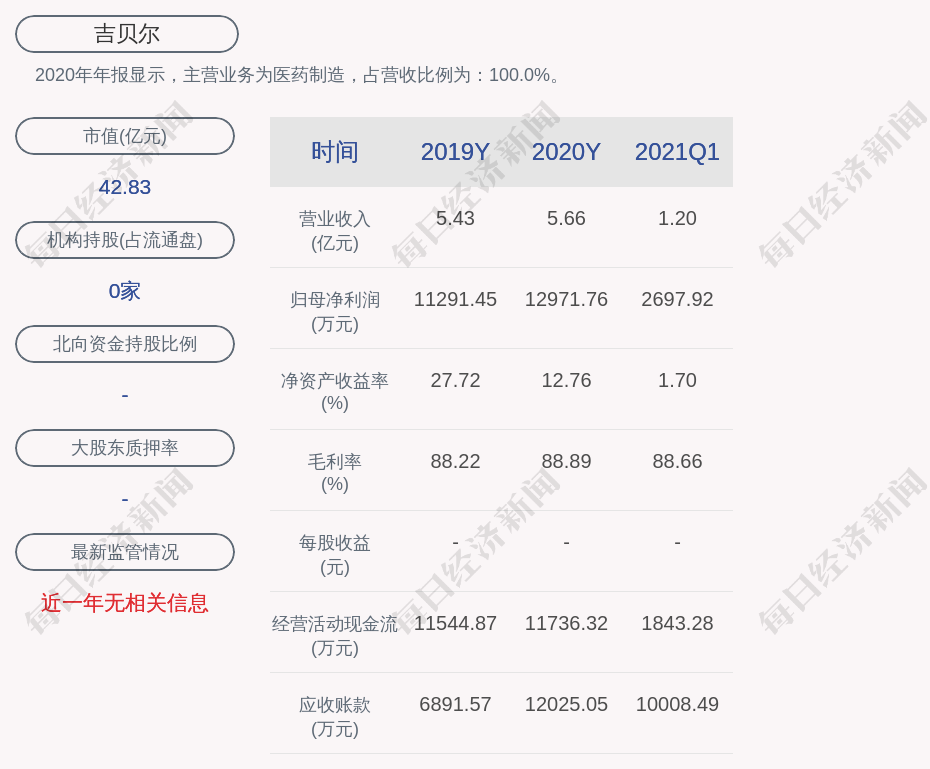 2020年年报显示,吉贝尔的主营业务为医药制造,占营收比例为:100.0%。
