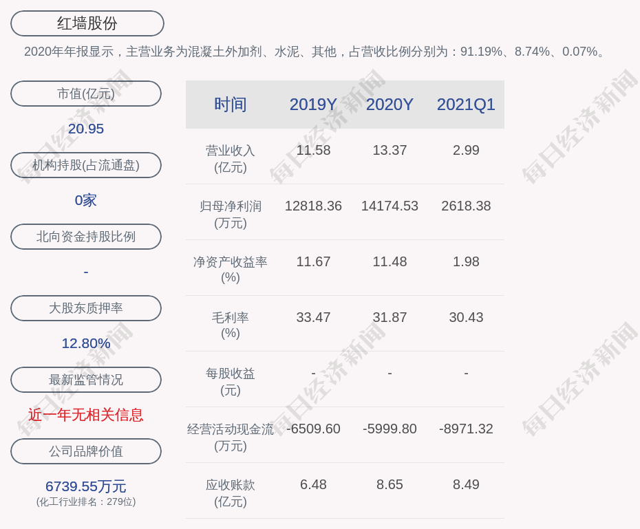 2020年年报显示,红墙股份的主营业务为混凝土外加剂、水泥、其他,占营收比例分别为:91.19%、8.74%、0.07%。
