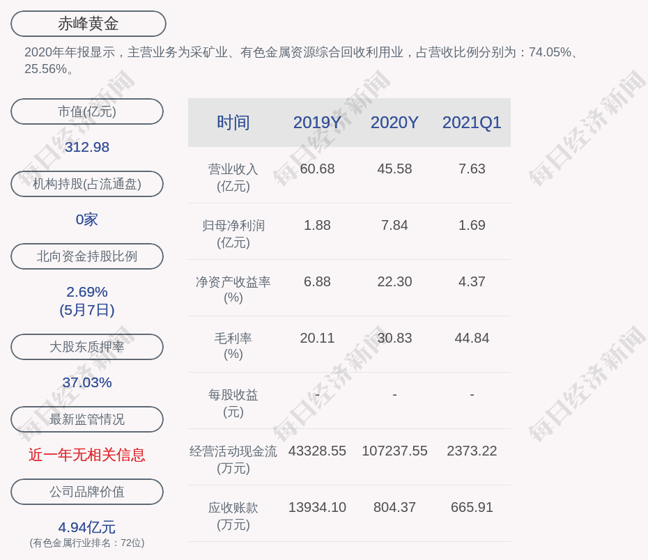 2020年年报显示,赤峰黄金的主营业务为采矿业、有色金属资源综合回收利用业,占营收比例分别为:74.05%、25.56%。