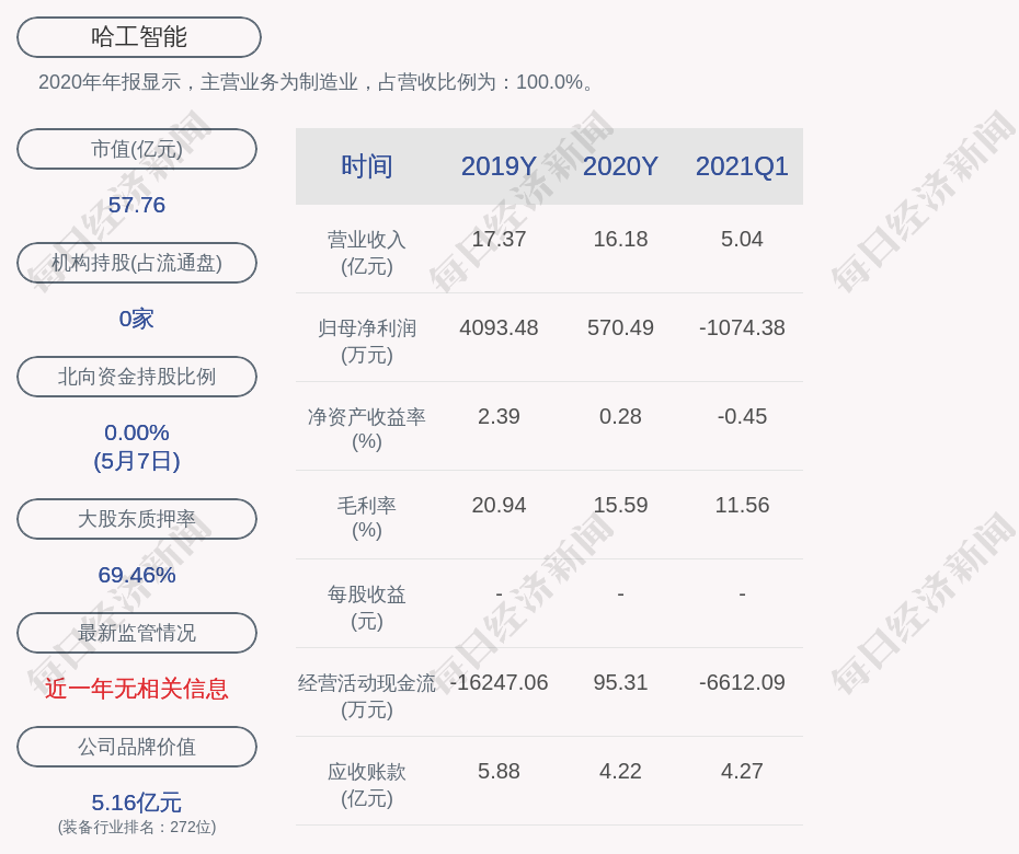 2020年年报显示,哈工智能的主营业务为制造业,占营收比例为:100.0%。
