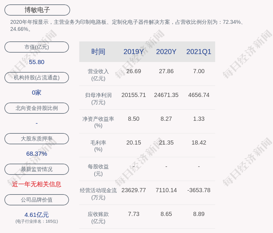 2020年年报显示,博敏电子的主营业务为印制电路板、定制化电子器件解决方案,占营收比例分别为:72.34%、24.66%。