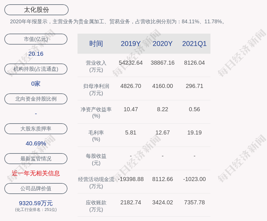 2020年年报显示,太化股份的主营业务为贵金属加工、贸易业务,占营收比例分别为:84.11%、11.78%。