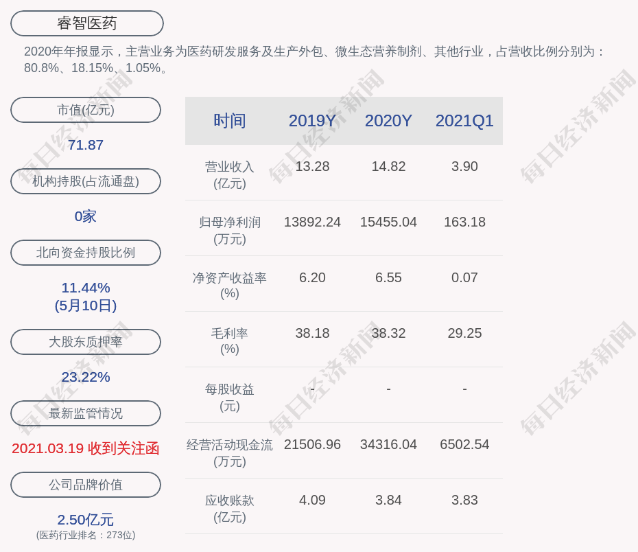 2020年年报显示,睿智医药的主营业务为医药研发服务及生产外包、微生态营养制剂、其他行业,占营收比例分别为:80.8%、18.15%、1.05%。