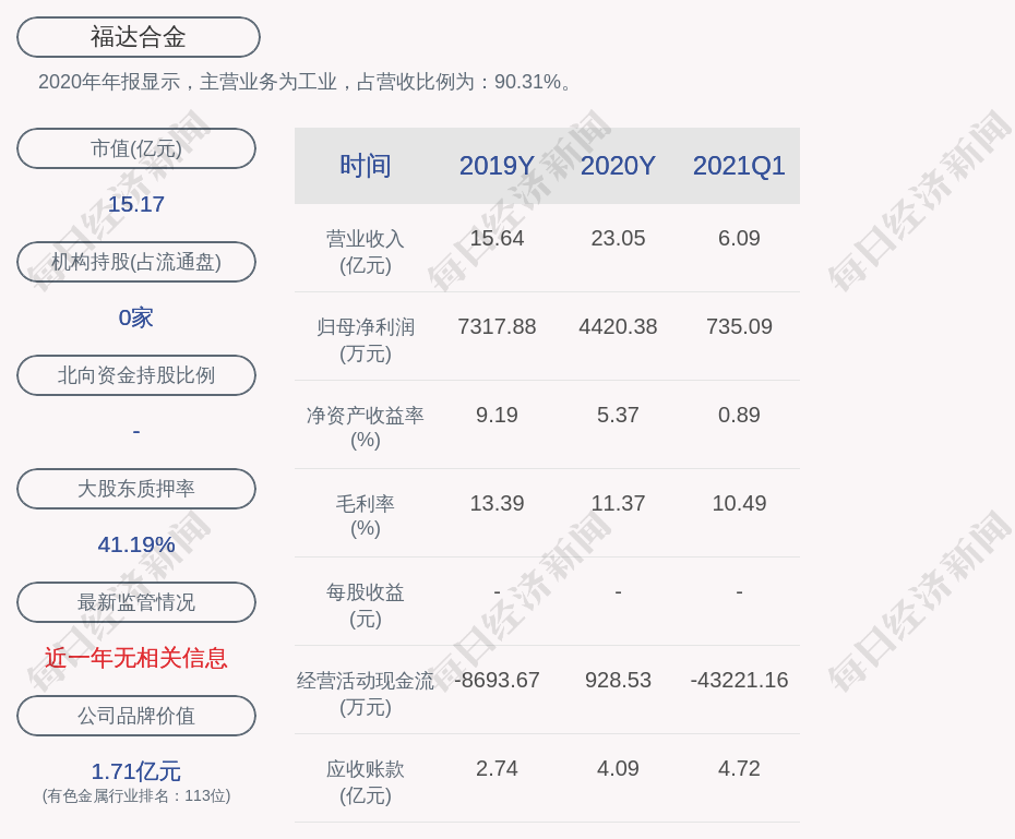2020年年报显示,福达合金的主营业务为工业,占营收比例为:90.31%。