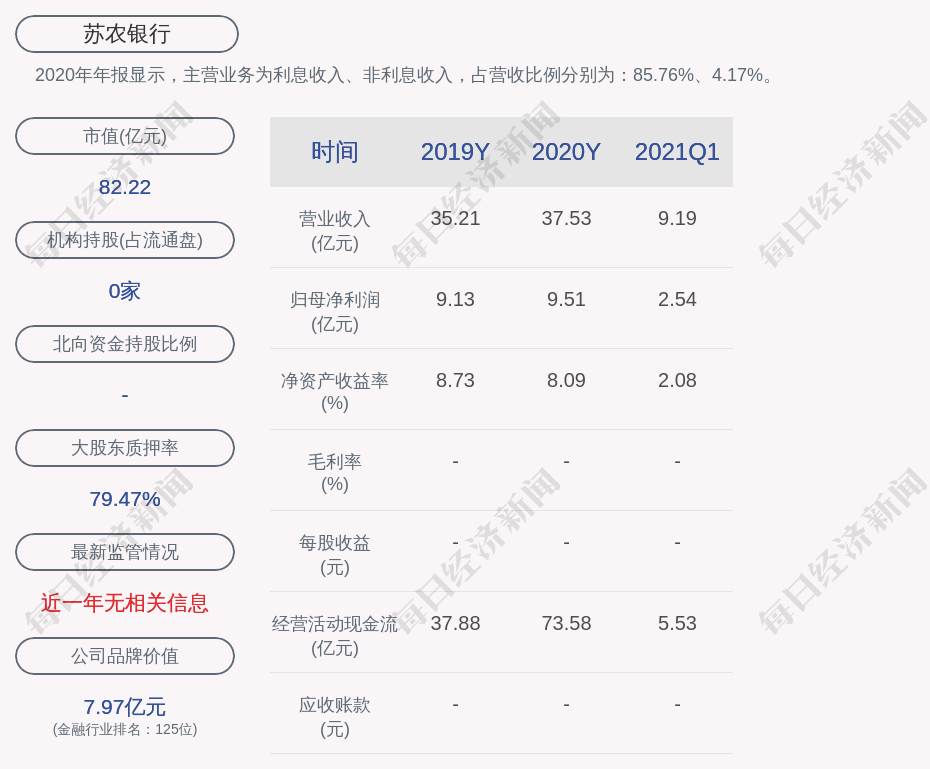2020年年报显示,苏农银行的主营业务为利息收入、非利息收入,占营收比例分别为:85.76%、4.17%。