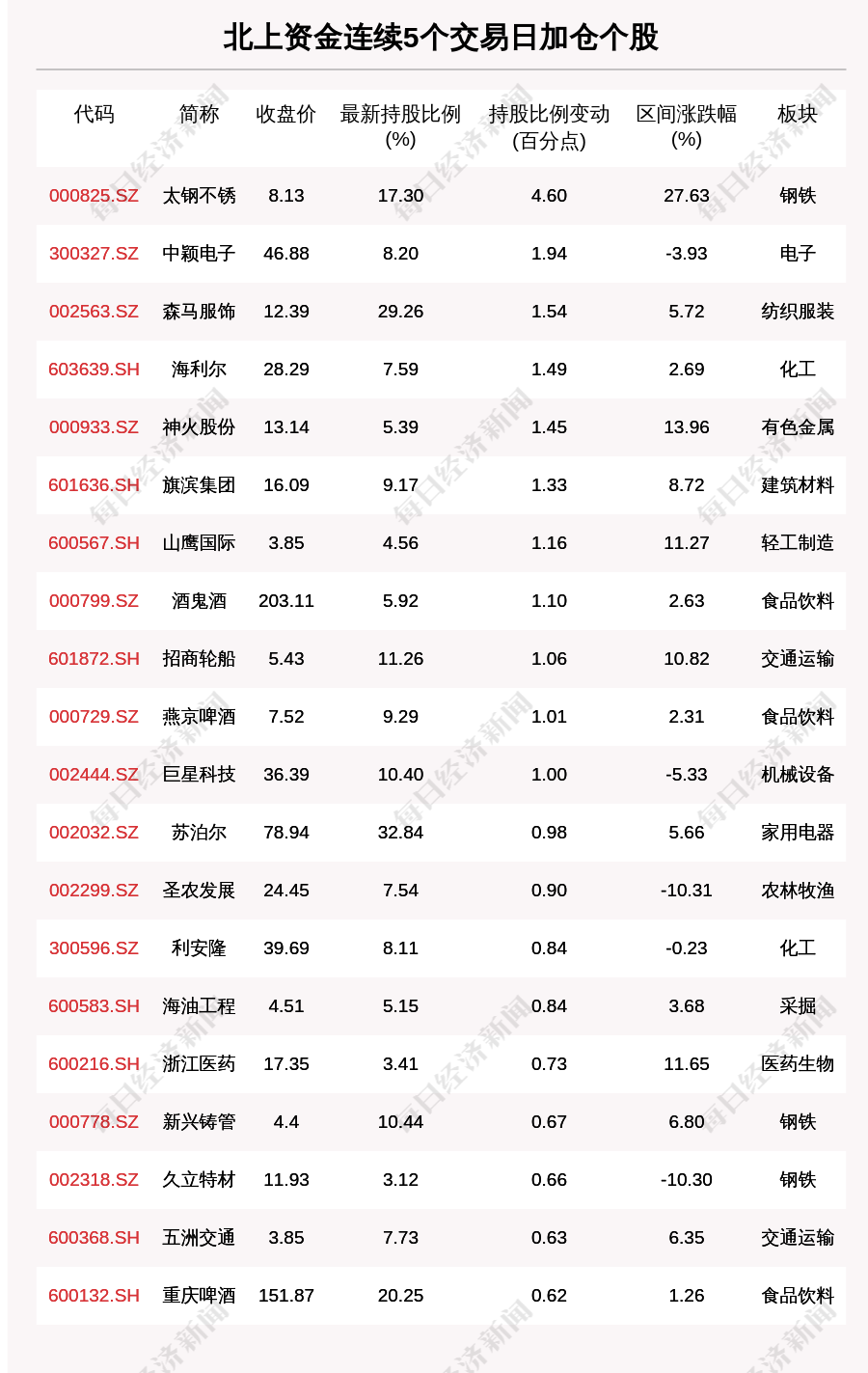 每经AI快讯,5月11日,北上资金连续5个交易日买入60个股。北上资金连续5个交易日加仓个股中,太钢不锈(000825.SZ,收盘价:8.13元)5个交易日获增持4.60个百分点,其他增持比例较大的个股包括中颖电子(300327.SZ,收盘价:46.88元)、森马服饰(002563.SZ,收盘价:12.39元)、海利尔(603639.SH,收盘价:28.29元),分别增持1.94个百分点、1.54个百分点、1.49个百分点。