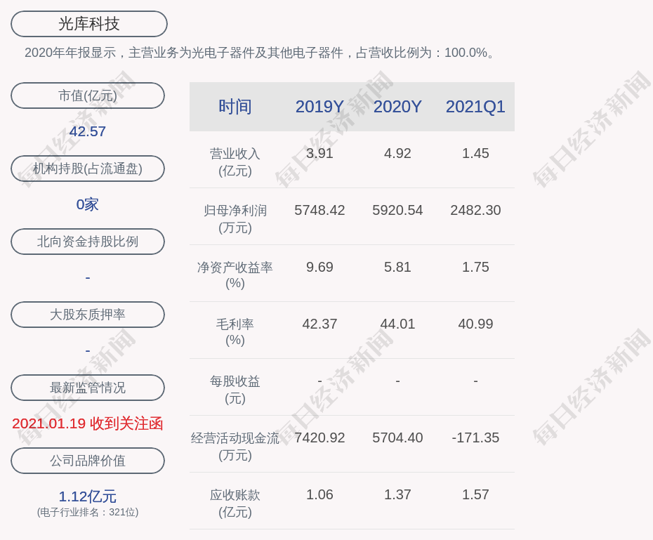 2020年年报显示,光库科技的主营业务为光电子器件及其他电子器件,占营收比例为:100.0%。