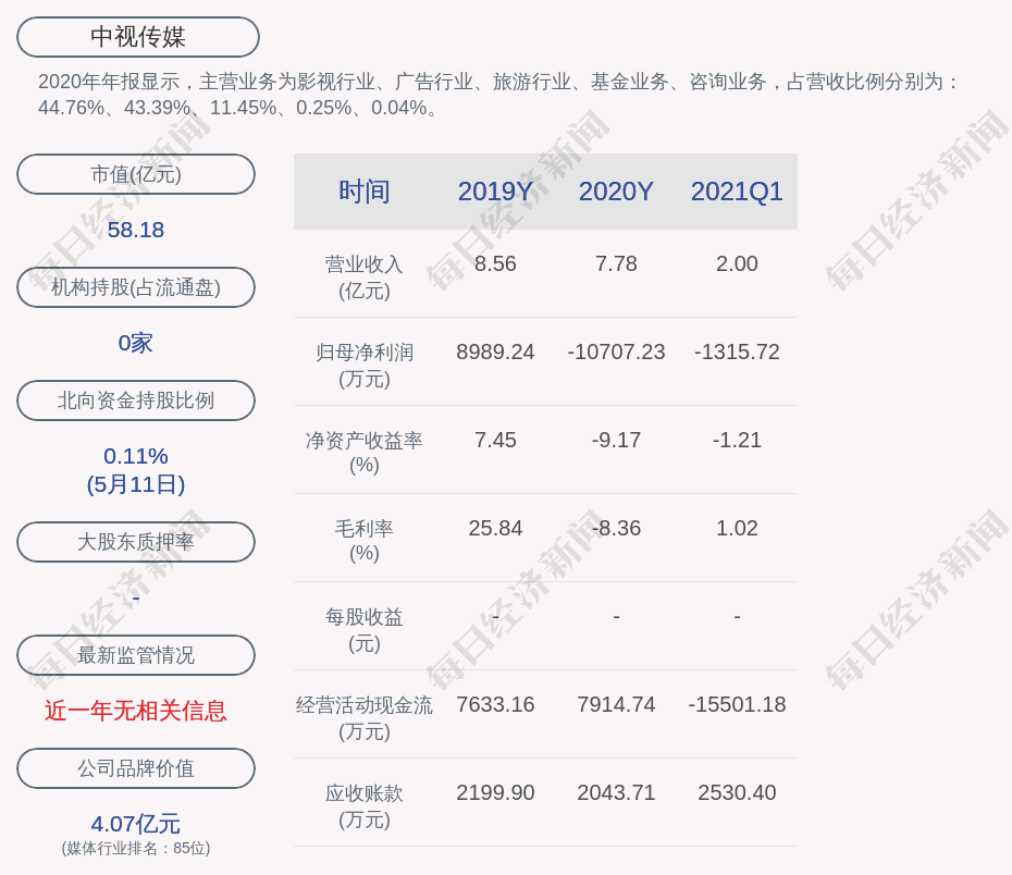 2020年年报显示,中视传媒的主营业务为影视行业、广告行业、旅游行业、基金业务、咨询业务,占营收比例分别为:44.76%、43.39%、11.45%、0.25%、0.04%。