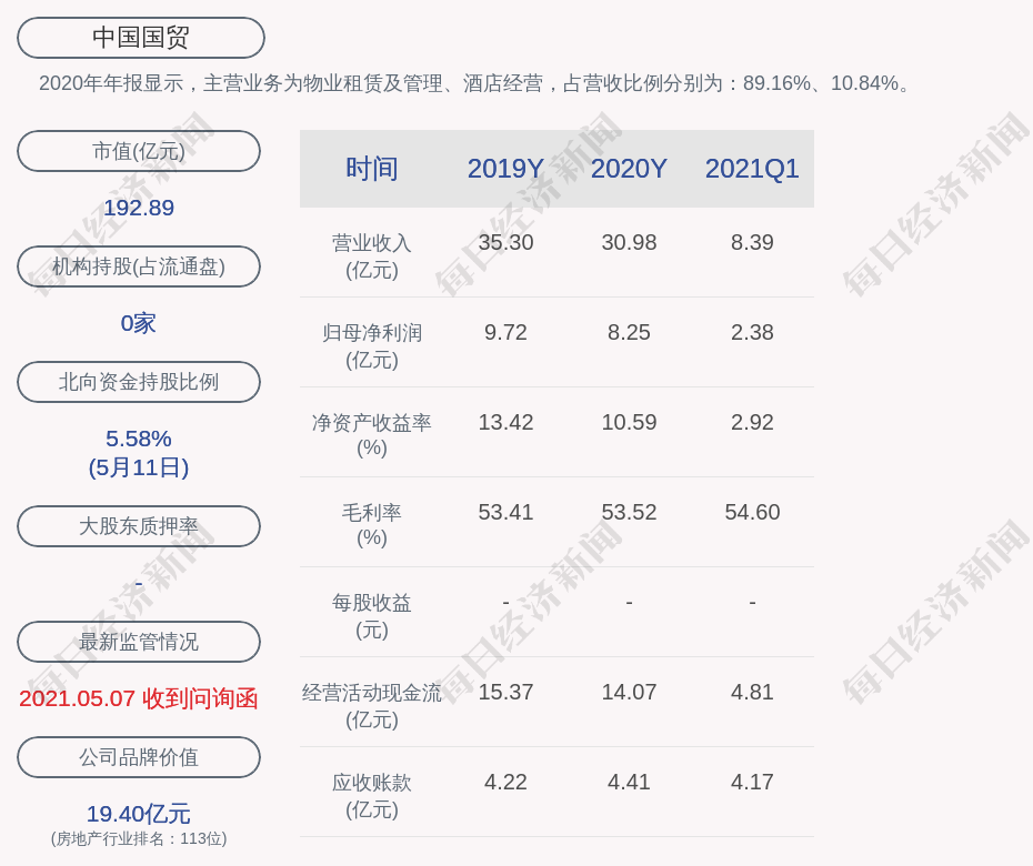 2020年年报显示,中国国贸的主营业务为物业租赁及管理、酒店经营,占营收比例分别为:89.16%、10.84%。