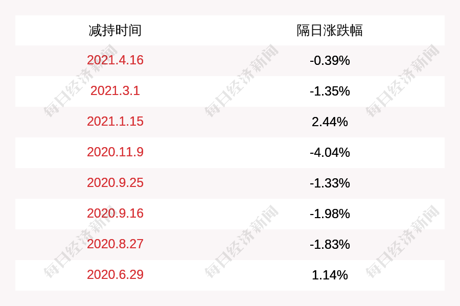 2. 和晶科技上次发布减持公告是2021年04月16日,第二个交易日下跌0.39%,和晶科技近一年共发布9次减持类公告。更多关键信息,请搜索“道达号”。