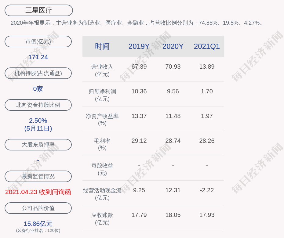 2020年年报显示,三星医疗的主营业务为制造业、医疗业、金融业,占营收比例分别为:74.85%、19.5%、4.27%。
