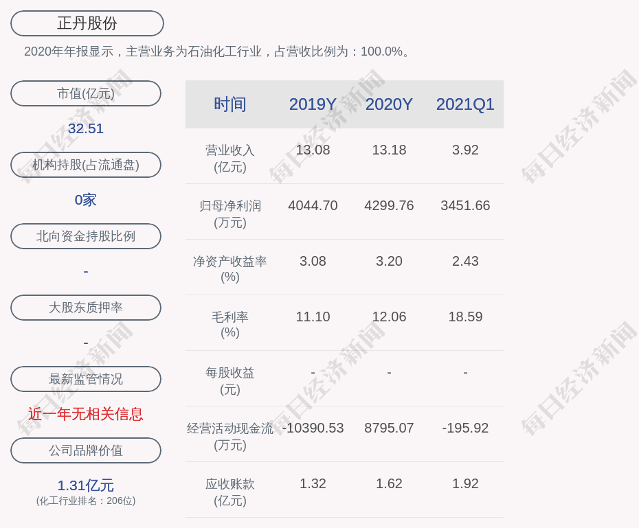 2020年年报显示,正丹股份的主营业务为石油化工行业,占营收比例为:100.0%。