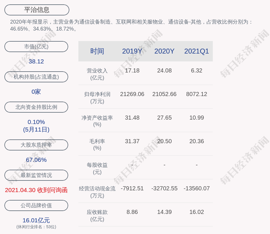 2020年年报显示,平治信息的主营业务为通信设备制造、互联网和相关服物业、通信设备-其他,占营收比例分别为:46.65%、34.63%、18.72%。