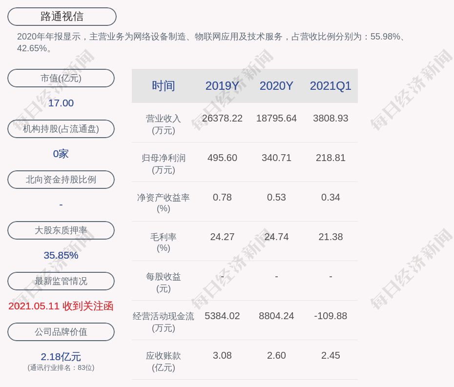 2020年年报显示,路通视信的主营业务为网络设备制造、物联网应用及技术服务,占营收比例分别为:55.98%、42.65%。
