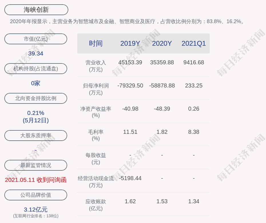每经AI快讯,2021年5月11日,深交所向海峡创新(SZ 300300,最新价:5.86元)发出问询函:针对“年报显示,公司2020年实现营业收入3.54亿元,同比下降21.69%,归属于母公司净利润-5.89亿元;2019年实现营业收入4.52亿元,同比下滑14.43%,归属于母公司净利润为-7.93亿元。你公司2016至2020年销售毛利率分别为27.18%、20.84%、14.83%、11.51%、1.82%,毛利率水平逐年下滑;扣除非经常性损益后归属母公司股东的净利润分别为-1111.79万元、-289.15万元、3595.98万元、约-8.9亿元、约-2.88亿元,除2018年因你公司按照权益法对参股公司微贷(杭州)金融信息服务有限公司确认投资收益约1亿元进而实现扣非后净利润为正外,其余年份扣非后净利润均为负。截至2020年末,你公司未弥补亏损超过实收资本总额的三分之一。”等情况,深交所提出包括“结合报告期内智慧城市、智慧医疗业务开展情况、新订单签署及在手订单执行情况,自营影城、互联网金融、中美远程会诊、租赁物业服务等业务开展情况、处置进展及业务合规性风险(如有),极光大数据、MCAC、微贷网、影视制作等对外投资及参股公司经营业绩及公允价值变动情况,及各业务板块的收入利润情况等,量化分析你公司营业收入持续下滑且连续大幅亏损的具体原因,并说明拟采取的改善措施。”等要求。请公司就相关问题做出书面说明,在5月18日前将有关说明材料报送我部并对外披露。