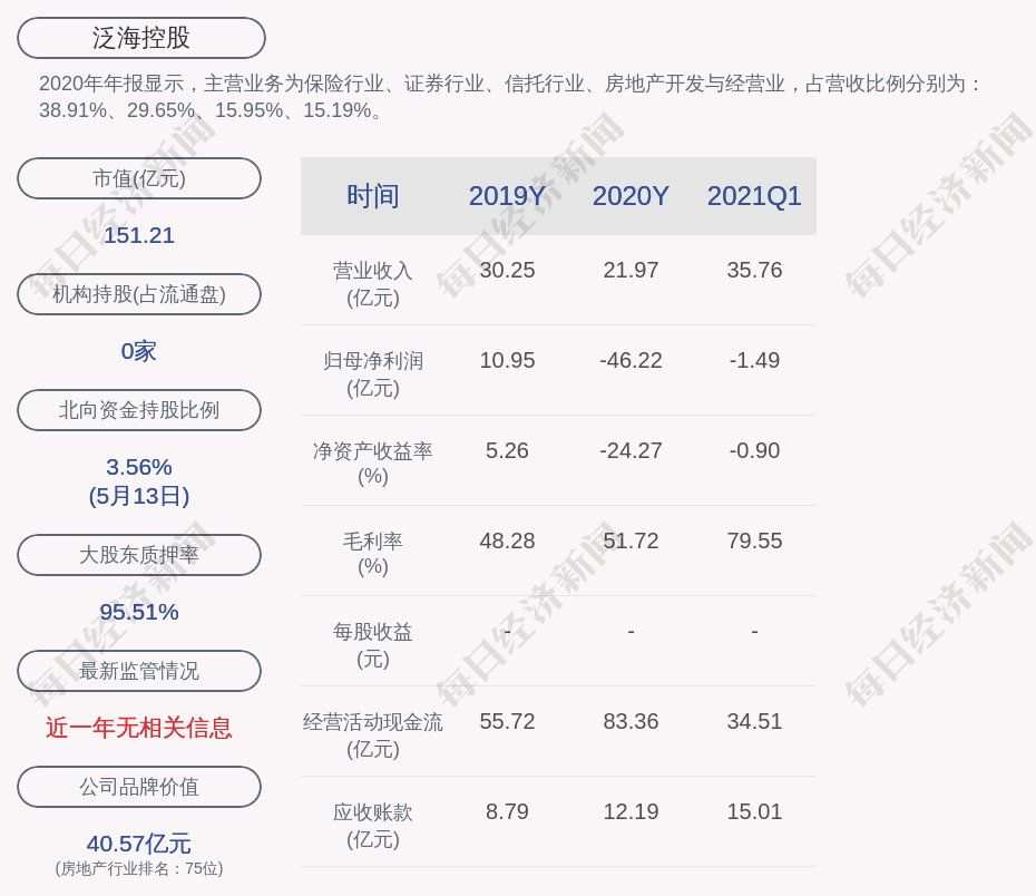 2020年年报显示,泛海控股的主营业务为保险行业、证券行业、信托行业、房地产开发与经营业,占营收比例分别为:38.91%、29.65%、15.95%、15.19%。