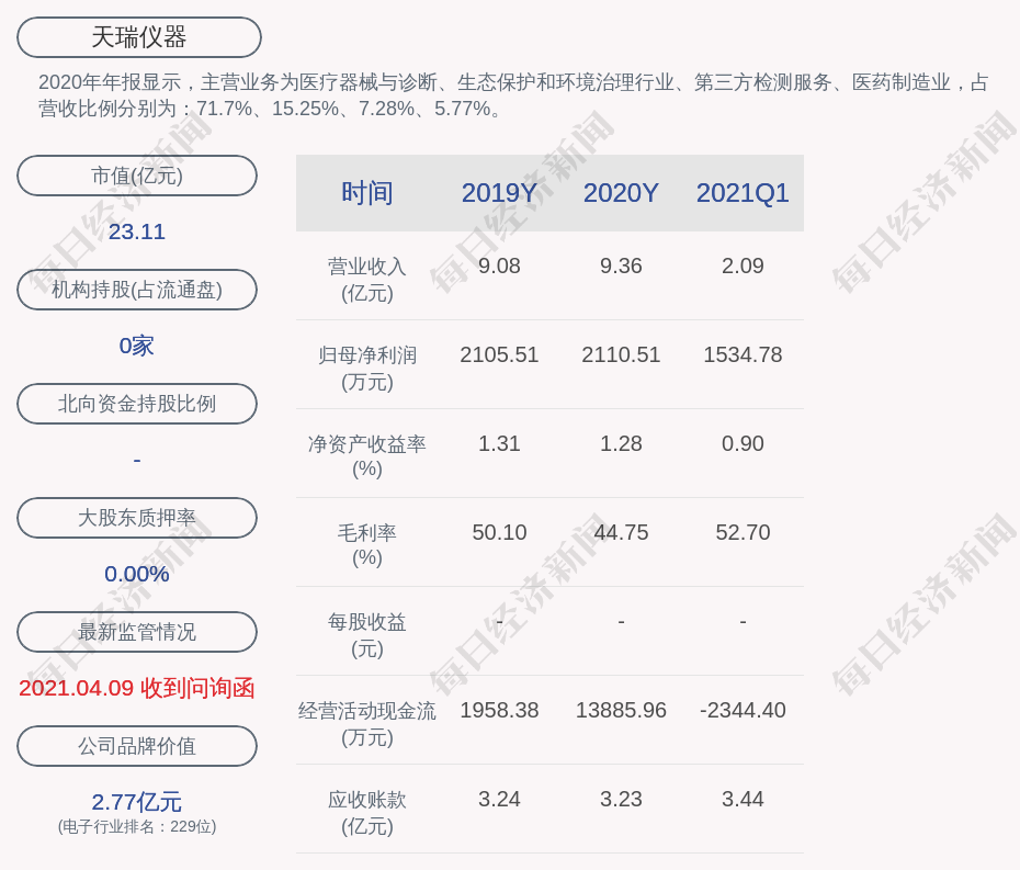 2020年年报显示,天瑞仪器的主营业务为医疗器械与诊断、生态保护和环境治理行业、第三方检测服务、医药制造业,占营收比例分别为:71.7%、15.25%、7.28%、5.77%。