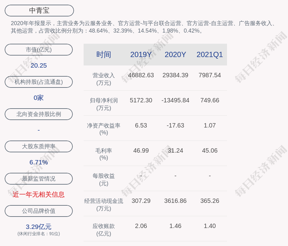 2020年年报显示,中青宝的主营业务为云服务业务、官方运营-与平台联合运营、官方运营-自主运营、广告服务收入、其他运营,占营收比例分别为:48.64%、32.39%、14.54%、1.98%、0.42%。