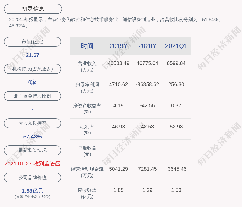 2020年年报显示,初灵信息的主营业务为软件和信息技术服务业、通信设备制造业,占营收比例分别为:51.64%、45.32%。