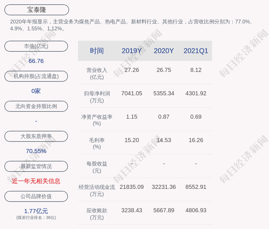 2020年年报显示,宝泰隆的主营业务为煤焦产品、热电产品、新材料行业、其他行业,占营收比例分别为:77.0%、4.9%、1.55%、1.12%。