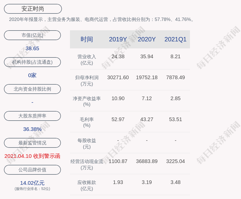 2020年年报显示,安正时尚的主营业务为服装、电商代运营,占营收比例分别为:57.78%、41.76%。
