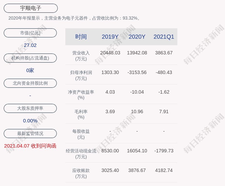 2020年年报显示,宇顺电子的主营业务为电子元器件,占营收比例为:93.32%。