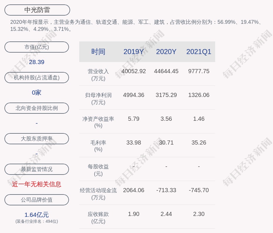 2020年年报显示,中光防雷的主营业务为通信、轨道交通、能源、军工、建筑,占营收比例分别为:56.99%、19.47%、15.32%、4.29%、3.71%。