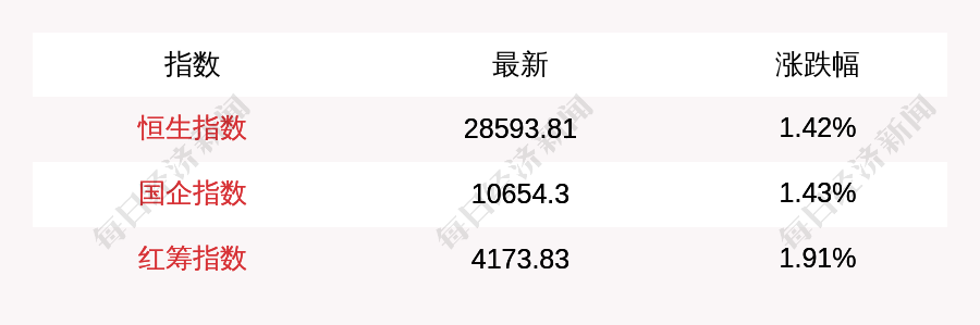每经AI快讯:北京时间5月18日16:00,恒生指数收盘上涨399.72点,涨幅为1.42%,报收28593.81点;国企指数收盘上涨150.46点,涨幅为1.43%,报收10654.3点;红筹指数收盘上涨78.22点,涨幅为1.91%,报收4173.83点。南向资金当日净流入43.77亿元。
