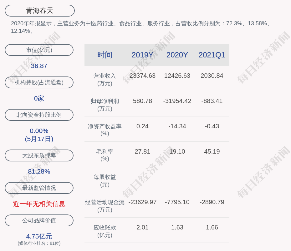 2020年年报显示,青海春天的主营业务为中医药行业、食品行业、服务行业,占营收比例分别为:72.3%、13.58%、12.14%。