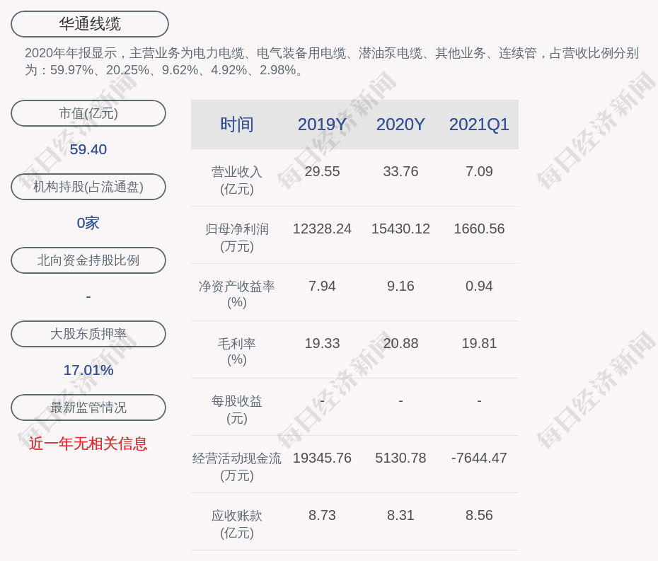 2020年年报显示,华通线缆的主营业务为电力电缆、电气装备用电缆、潜油泵电缆、其他业务、连续管,占营收比例分别为:59.97%、20.25%、9.62%、4.92%、2.98%。