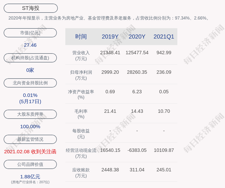 2020年年报显示,ST海投的主营业务为房地产业、基金管理费及养老服务,占营收比例分别为:97.34%、2.66%。