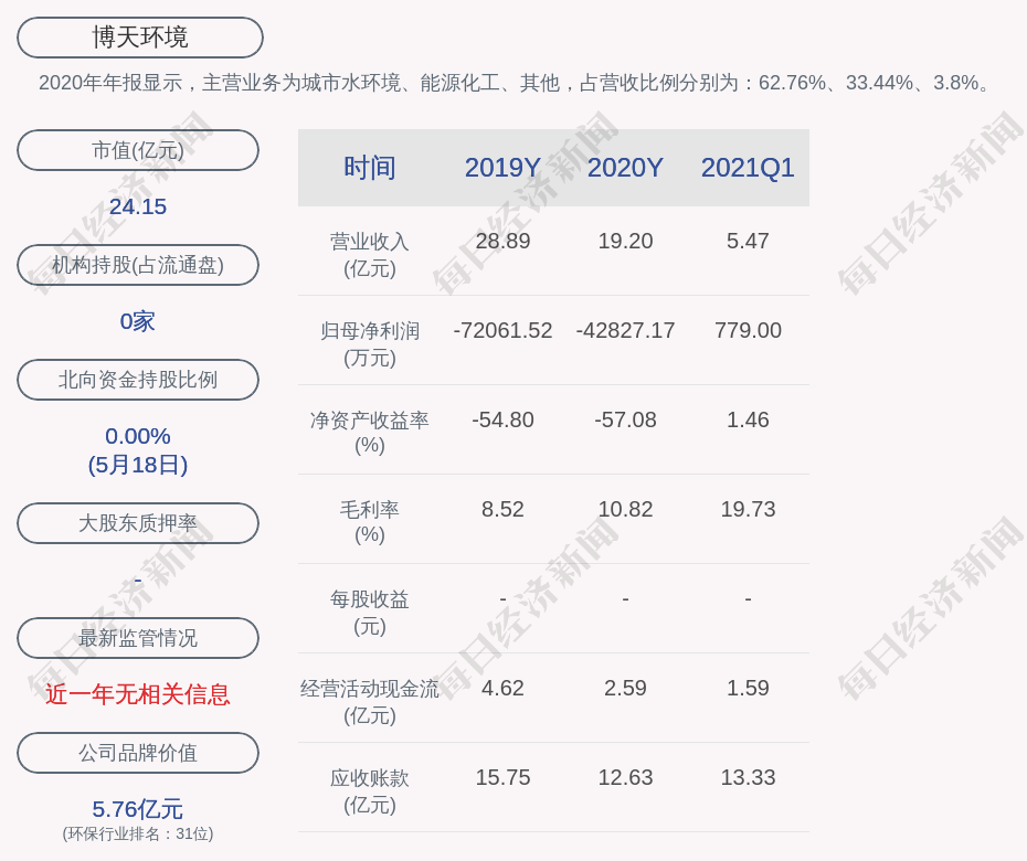 2020年年报显示,博天环境的主营业务为城市水环境、能源化工、其他,占营收比例分别为:62.76%、33.44%、3.8%。