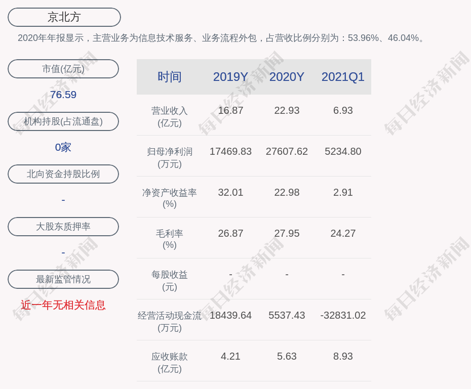 2020年年报显示,京北方的主营业务为信息技术服务、业务流程外包,占营收比例分别为:53.96%、46.04%。
