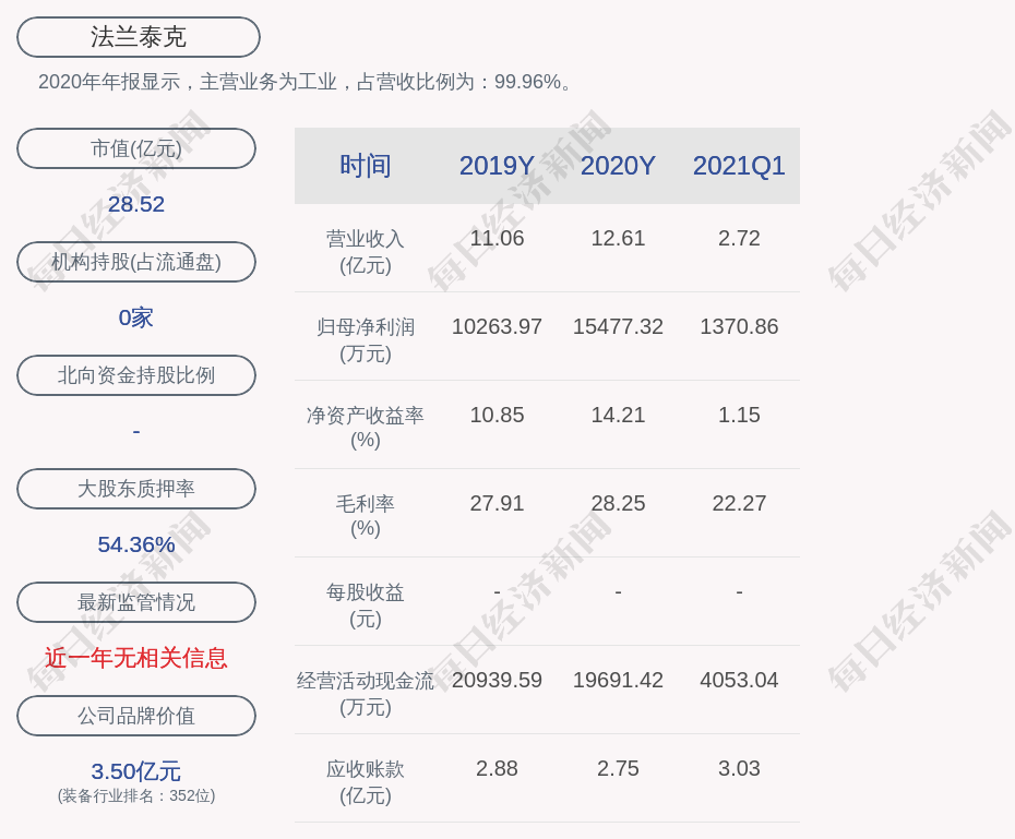 2020年年报显示,法兰泰克的主营业务为工业,占营收比例为:99.96%。