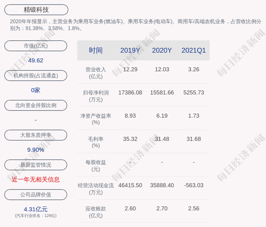 2020年年报显示,精锻科技的主营业务为乘用车业务(燃油车)、乘用车业务(电动车)、商用车/高端农机业务,占营收比例分别为:91.38%、3.58%、1.8%。