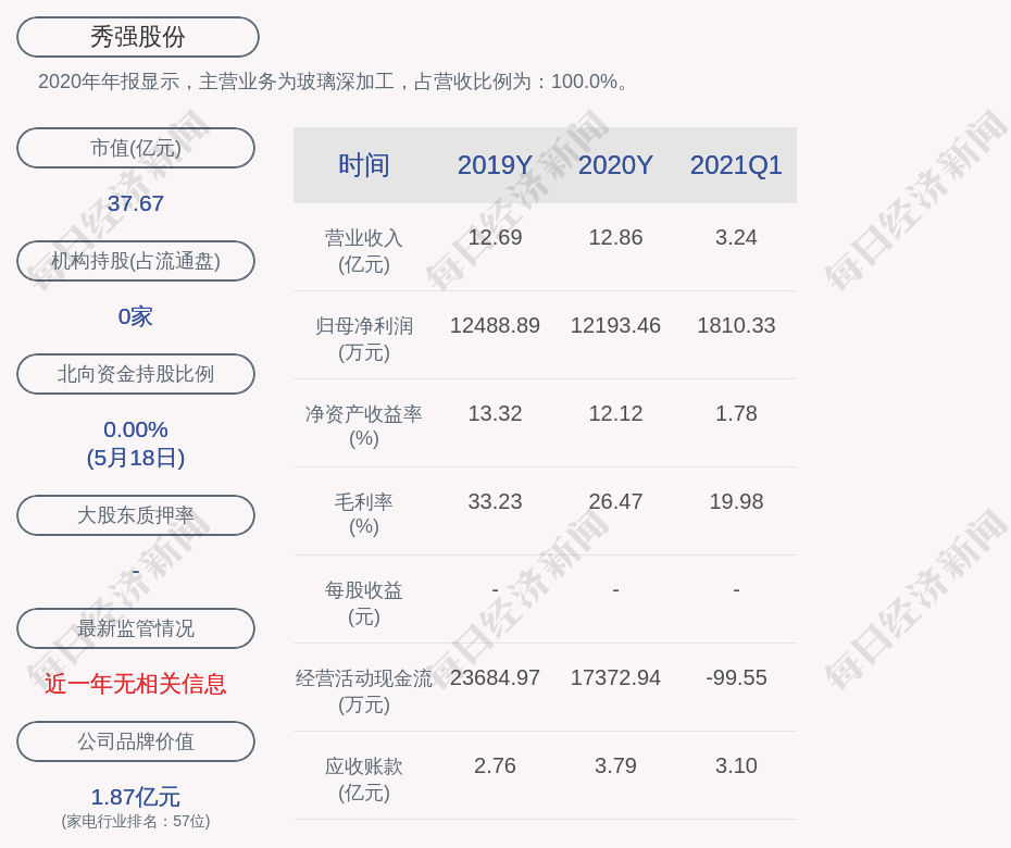 2020年年报显示,秀强股份的主营业务为玻璃深加工,占营收比例为:100.0%。