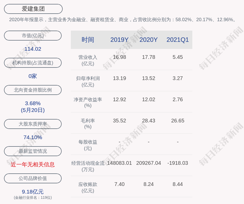 2020年年报显示,爱建集团的主营业务为金融业、融资租赁业、商业,占营收比例分别为:58.02%、20.17%、12.96%。