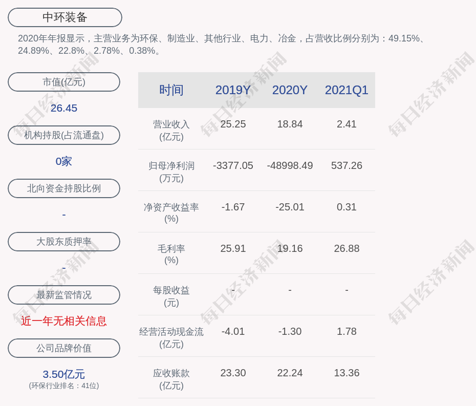 2020年年报显示,中环装备的主营业务为环保、制造业、其他行业、电力、冶金,占营收比例分别为:49.15%、24.89%、22.8%、2.78%、0.38%。