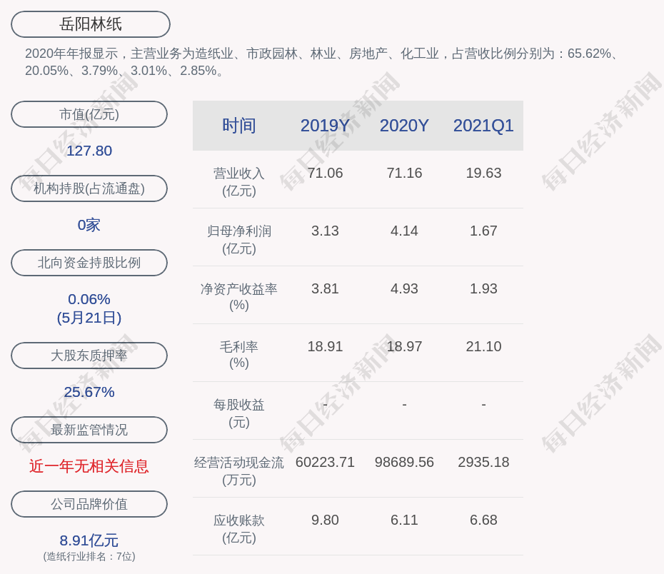 2020年年报显示,岳阳林纸的主营业务为造纸业、市政园林、林业、房地产、化工业,占营收比例分别为:65.62%、20.05%、3.79%、3.01%、2.85%。