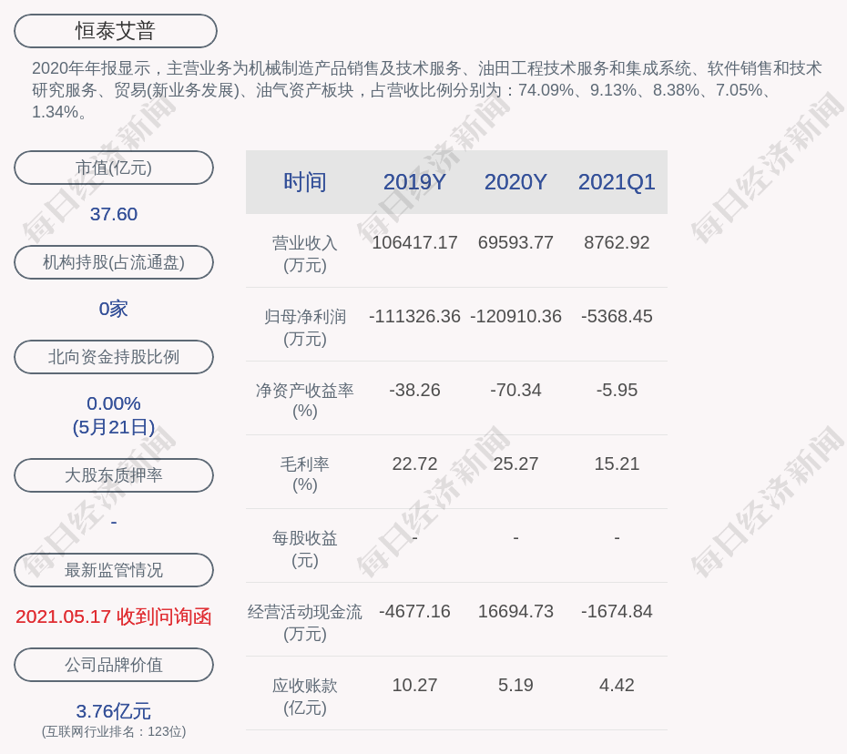 2020年年报显示,恒泰艾普的主营业务为机械制造产品销售及技术服务、油田工程技术服务和集成系统、软件销售和技术研究服务、贸易(新业务发展)、油气资产板块,占营收比例分别为:74.09%、9.13%、8.38%、7.05%、1.34%。
