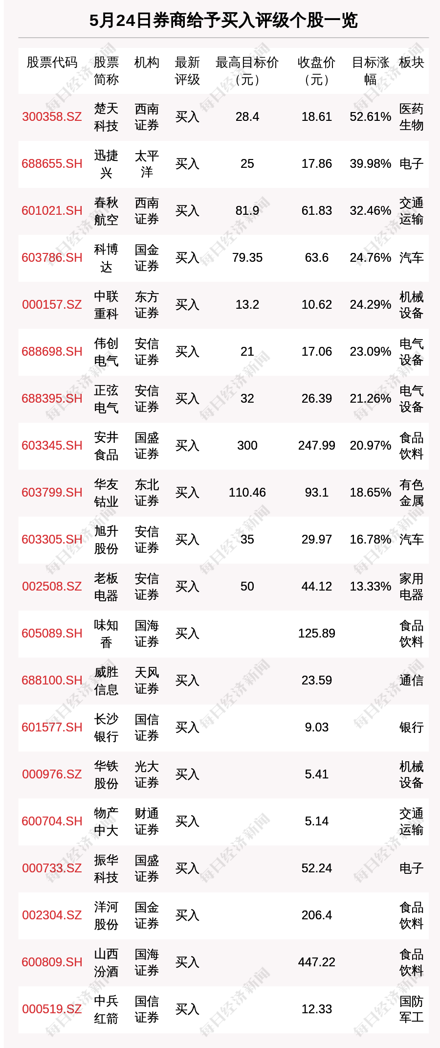每经AI快讯,5月24日,券商给予评级的个股数共有30只,获得买入评级的个股数共有20只。在公布了目标价格的11只个股中,按照最新收盘价计算,预期涨幅排名居前的个股是楚天科技(300358.SZ)、迅捷兴(688655.SH)、春秋航空(601021.SH),预期涨幅分别是52.61%、39.98%、32.46%。