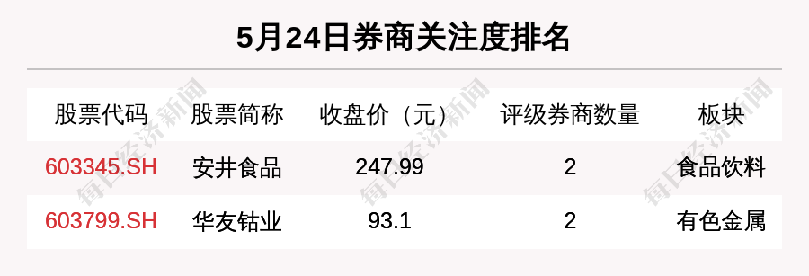 从券商对个股的关注程度来看,有2只个股获得多家券商关注,券商关注数量排名居前的个股是安井食品(603345.SH)、华友钴业(603799.SH)。