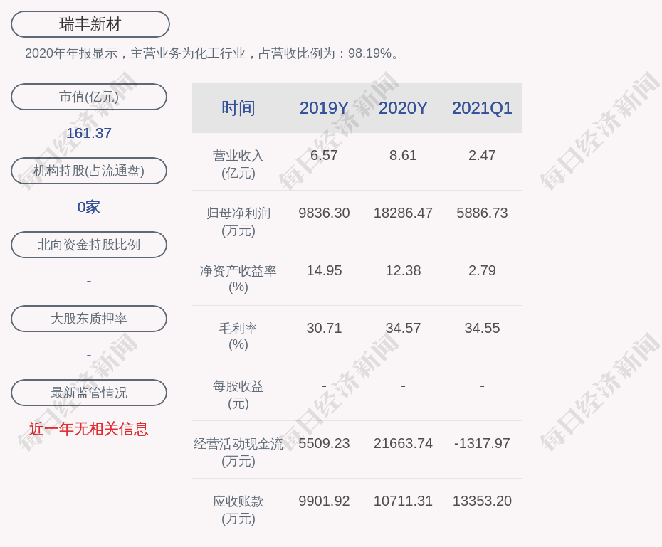 2020年年报显示,瑞丰新材的主营业务为化工行业,占营收比例为:98.19%。