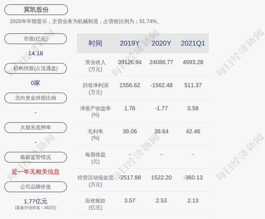 2020年年报显示,冀凯股份的主营业务为机械制造,占营收比例为:91.74%。
